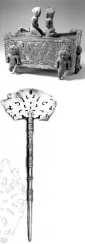 中国的妆奁文化历史久矣,在西周至秦汉时期,奁多为铜、陶器,且一般器腹较深,底有三足,旁有兽衔耳环,风格粗朴。在山东省文物精品大展中,即展出了一件西周时期的铜奁,这件造型和题材内容非常奇特的奁出土于山东莒县,最初由清末莒县文物鉴赏家庄湛岩收藏。铜奁高5厘米,长12厘米、宽5厘米,呈长方形,直壁稍微内收,顶部有两扇可对开的小盖,每盖一纽,分别为男、女裸体人物,呈面对面跪坐状。奁下部,铸有六个人形器足,皆裸体、屈膝,双手在后背负器身。以裸人为题材应与祈求种族繁衍的思想有关,象征着子孙繁衍之意。