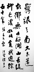 那天,他乘酒兴一口气给我留下两幅字。其中一幅是这么写的:“羁旅天南久未还,故乡无此好湖山;长堤柳色浓如此,觅我游踪五十年。”颇具唐风的七言绝句,流露出他对昆明那种强烈而缠绵的感情。