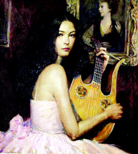 当华人社区对这位“英雄”赞不绝口时,徐纯中也成了最受好莱坞明星欢迎的画家。画册中一幅《甜蜜的琴声》正是当红女星凯瑟琳.泽塔.琼斯的肖像画。据徐纯中回忆,泽塔.琼斯当时特地从好莱坞借了一把十分名贵的古琴,还选了一件粉色衣服,来突出自己象牙白的肤色。不过,性格活泼的泽塔.琼斯每次坐不到十分钟,就要起身吃东西、接电话,或者吩咐仆人做什么事。徐纯中笑说,“过了3个半小时,我还没有画完,泽塔.琼斯有些不耐烦了。于是,我只能带着未完成的初稿回去上色。作品完成后,她对我的作品非常满意,并与我相约每隔两年,为她画一次肖像,现在我已经着手第三幅了。”