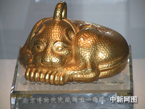 记者隔着玻璃窗看到,一只脖套项圈的金豹身覆鳞片,半蹲于座,鳞片在灯光映照下闪烁,光彩灼人,整座展品有着强烈的立体感。“这叫金兽,古时作保财镇库之用,迄今为止仍是中国出土文物中最大最重的金器”,南京市博物院院长龚良如是说。