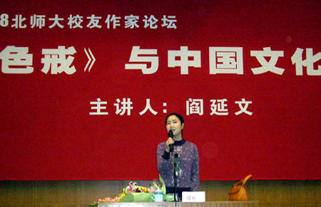 日前,女作家阎延文应母校北师大文学院邀请,在北师大针对文化热点问题,进行了一场题为《色戒与中国文化》的讲座。英东学术会堂,在讲座开始前即已爆满,两个小时的讲座始终处在热烈气氛中。