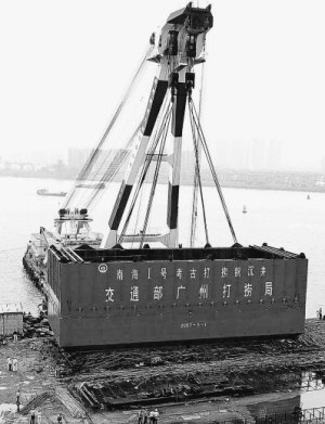 有关方面预计,整个工程处理和捞起的泥沙、瓷器及各种文物将超过5000吨。为了保证将“南海Ⅰ号”成功吊起,交通部广州打捞局在“华天龙”起吊的同时,计划安排一艘全潜驳船及时插入“南海Ⅰ号”底部将其托住,并承载整体平移,让打捞万无一失。