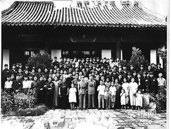 这张老照片可不是大户人家的集体合影,而是一张不同寻常的结婚照。其不寻常之处在于:它反映了北京和平解放后,第一个新式婚礼的隆重场面。照片中间位置胸戴大红花,表情有些羞涩的一对新人正是新式婚礼的主角。