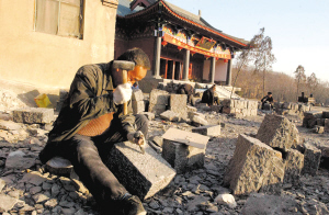 进入山门内,一座壮观的金顶大雄宝殿坐北朝南,院内一片繁忙景象,50多位石匠正在用老式的打石方式,一块一块击打着青石,切好的石块被抬到大雄宝殿一东一西在建的两座建筑上。