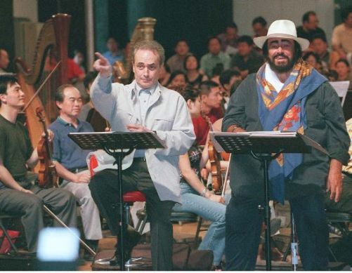 2001年6月,先期到达北京参加世界三大男高音午门演唱会的帕瓦罗蒂和卡雷拉斯,20日下午与中国中央歌剧院的演员和乐队一起排练。 中新社发 李刚 摄