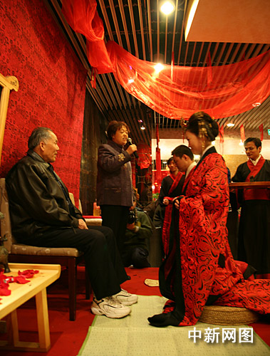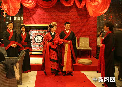 中新网1月20日电 1月19日晚,北京一对新人举行了一场庄重典雅的汉民族传统婚礼——周制婚礼,新人服饰、现场布置和仪程设计,均以自周流传至秦、汉的婚俗为依托。