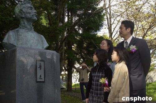 日本仙台市2004年10月举行隆重的“碑前祭”,纪念鲁迅留学仙台一百周年。图为应邀前来参加有关纪念活动的鲁迅的孙子周令飞、孙女周宁,以及两位曾外孙女,在仙台市青叶山麓的鲁迅纪念像前深情缅怀先人。 中新社发 王健 摄
