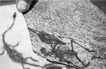 记者有幸在开展的第一时间看到了这件标本。这只像燕子般大小的史前动物,此时静静地躺在灰黑色的页岩中,全身的化石骨架保存得完好而精美,全身的骨骼呈黑色,凸现在岩石上,清晰可见,煞是可爱。它的嘴巴尖长,嘴里看不到一颗牙齿,眼睛很大,前翅伸出,后肢舒展。它的发现者和主要研究者、中科院古脊椎所研究员汪筱林博士告诉记者,由于这只翼龙体型如此娇小玲珑,发现初期人们还无法判断其个体发育年龄:是刚刚出生不久的“新生儿”,还是已经成长为“青少年”,或者已经进入成年?