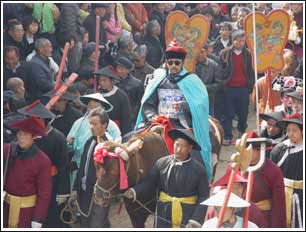 为了迎接身穿清朝官服、嘴角边耷拉着两撇长胡须、带着圆饼状墨镜的主角——“牛老爷”,村民们早早就忙活起来。这次耍社火,主角“牛老爷”可是从全村人中按照德貌双全的标准筛选出来的。“牛老爷”穿靴戴帽挂官服,装扮成清朝官员,还骑头大黄牛,煞是威风。