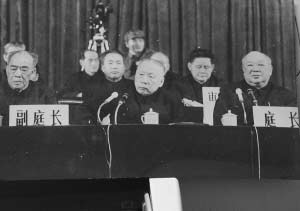 1980年伍修权(前排中)在法庭上穿着制服审判时的情景。
