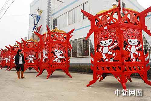 中新网保定3月14日电(吕子豪 刘向阳)记者今日从河北省曲阳县获悉,该县雕刻艺人为迎奥运制作的五盏巨型不锈钢“福娃”宫灯,经过五个月的紧张施工,终于正式完工。