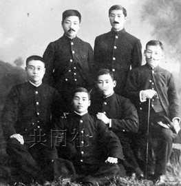 鲁迅(后排左)在仙台医科学校留学期间和朋友的黑白照合影。照片中鲁迅的胡子为房东之后用墨添上