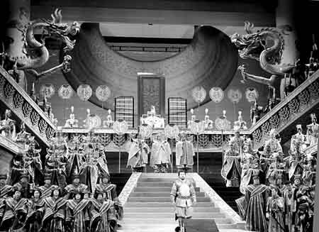 第二幕的宫廷场景也会给观众“惊艳”的感觉。第二幕的第一场是三个活宝大臣平、庞、朋追忆似水年华的“过场戏”,这一场的布景和灯光都比较低调;而第二场的猜谜情节是歌剧剧情的一大高潮,当灯光骤然打亮,一个高入云端、金碧辉煌的宫殿赫然出现在眼前的时候,连该剧的主创人员自己都被“震”了。为普契尼续写歌剧最后18分钟的中国作曲家郝维亚说,在国外看过不下10个版本的图兰朵,但这一场宫廷猜谜的舞台效果“太让人吃惊了”!