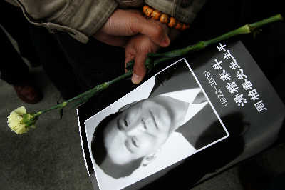 “高山仰止有底蕴幽默,松柏延绵无穷尽春色”,在洁白的百合丛中,一代滑稽戏大师周柏春安详地睡着了,他带走了他那经典的“冷面”,但留下的却是永远的笑声。昨天,滑稽戏泰斗周柏春的追悼会在龙华殡仪馆举行,数千名群众自发赶到现场,手持黄色康乃馨为周老送上最后一程。