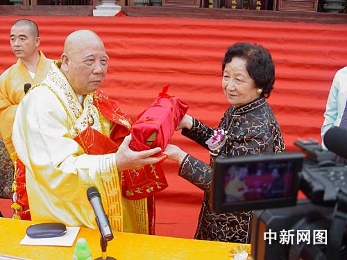 香港知名爱国人士、汉荣书局创始人石景宜先生的夫人刘紫英女士将《贝叶经》赠送给粤南海西樵山宝峰寺。 曾令华 摄