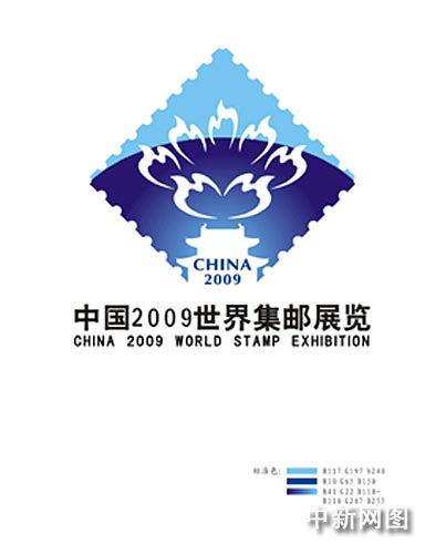 展徽为《飞向全球》,由福建卓文彬设计。该作品画面由洛阳古城楼、牡丹花、飞鸽、邮票、地球等形象和“中国2009”字样组成,在设计上突出了举办城市悠久的历史、厚重的文化和鲜明的地域特色。画面色调为渐变的蓝色色彩,象征和谐美好的明天。七只展翅翱翔的飞鸽形象描绘出盛开的牡丹花,代表邮展举办地洛阳作为牡丹花城的地域特色,并寓意要把中国2009世界邮展在洛阳举办的消息传到世界各地,彰显和平与发展等理念。