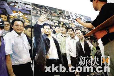 昨日,记者在作画现场看到很多熟悉的画面,有《敬礼娃娃》、《握笔的手》……而在《地劫·重生》长卷上还惊喜地发现,有一组创作正是取材于本报特派四川记者李洁军、王小明的一幅摄影作品,该新闻图片摄于5月16日上午,画面凝固的是当时胡锦涛总书记来到四川地震灾区北川羌族自治县,向当地群众和抢险武警官兵挥手慰问的瞬间。 (记者 陈琦钿 实习生 李淑子)