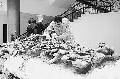 去年9月1日,东阳市文物管理办公室接到群众反映,城区一居民在“胡公山”发现几节裸露的红褐色骨头,文物办工作人员赴现场察看,初步确认为恐龙化石。9月2日,省自然博物馆金幸生副馆长等5位专家,确认在土层中裸露的三节红褐色“骨头”为恐龙椎骨化石。经20多天的抢救性清理发掘,9月26日上午,恐龙骨架化石成功挖掘后安全搬入东阳市博物馆。据悉,此次发现的恐龙骨骼化石包括10个背椎、6个荐椎、2个前部尾椎和腰带部分,化石呈自然状态连接。除了神经棘缺失、左肠骨前突错位外,其他部分均保存完整,是我国整体出土最完整的恐龙骨骼化石。