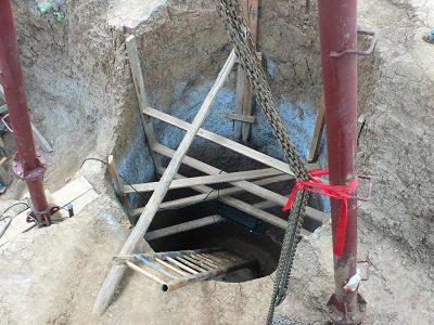 昨天下午,早报记者来到考古现场,看到一个小型起吊机已深入“井内”。据介绍,圆形的地宫如同一口深井,直径2.2米,在圆井的正中间,还发现四块石板拼起的方框,未见渗水,放有一层铜钱。华国荣表示,结构和内容正在逐步认识过程中。
