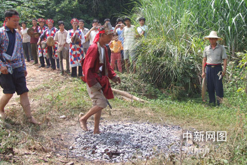 张嘴紧咬烧红温度达一千摄氏度以上的铁犁头,光着脚板踩踏过火红的木炭,表演者神情自若,毫发无损。广西南宁市邕宁区百济乡红星村村民黎开法表演的壮家绝技“口含烧红犁头”、“赤脚过火海”即“含火犁头过火链”,令人惊叹不已。