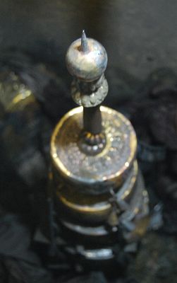 昨天,一位不愿透露姓名的金属工艺专家解释了塔刹的制作方法。宝塔的塔刹相轮和山花蕉叶采用的是一种叫作“锤揲法”的金银加工工艺。与铸造法相比,锤揲法工序相对简单一些,而且可以节省宝贵的金银原材料,其方法是先捶打金银板片,使之伸展成片状,将其铺在用松香、牛油和瓦灰等熬成的胶板上或模具上,再捶打出各种繁复的花纹。此次七宝阿育王塔有凸纹也有凹纹,这是两面捶揲的结果。