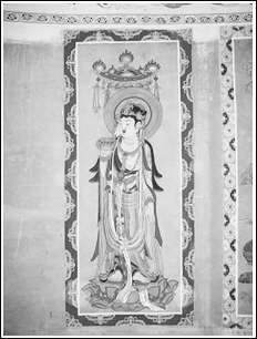 常嘉煌介绍,被盗的《药师菩萨像》图源自1907年法国人伯希和盗走的敦煌藏经洞唐代绢画,由李承仙先生复原放大绘制,壁画高210厘米,宽80厘米。这是敦煌现代石窟的第一幅壁画,也是李承仙生前留给敦煌的最后遗作。这幅壁画是在裱糊在洞窟墙壁上的丝绢上完成的,被盗时被整体揭下。