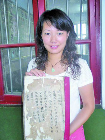 邓州市档案局工作人员展示馆存的《关氏家谱》