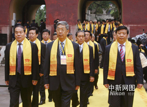 古磬敲响,身披黄色绶带的朝圣者们庄严步入属于先哲的历史时空,在杏坛与大成殿间缓缓止步。抬首仰望,巍然耸立的孔庙大成殿正如至圣先师,于云雾之间俯视黎庶,岿然等待着后世众人的朝拜。“继往开来,永兴此邦……”在山东省政协主席孙淑义的主持下,公祭大典开始。《天人合一》、《与时偕行》、《万世师表》等乐章依次响彻孔庙,在身着明代祭服的舞者簇拥之下,中国全国人大常委会原副委员长许嘉璐、中国文化部副部长周和平、中共山东省委副书记、省长姜大明、联合国教科文组织代表、孔子教育奖获奖代表、著名书画家范曾等朝圣者分别向先师孔子敬献花篮。