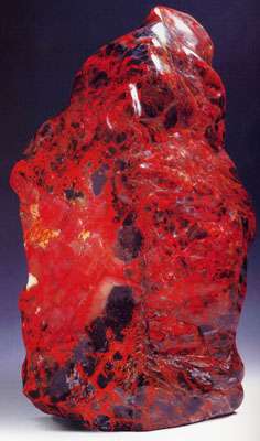 2005年,五月十八日,由内蒙古自制区巴林石协会和福建省宝玉石协会主办的“福州首届中国巴林石精品展”在福州特艺城举行,一块产于内蒙古草原重达三十六公斤,高五十一厘米、宽三十五点七厘米、厚二十四厘米的中国鸡血石王在展会上露面,据称该鸡血石价值上亿元人民币。 中新社发 王东明 摄