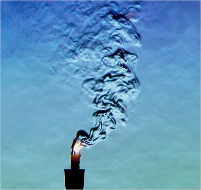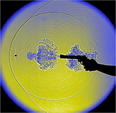 条纹摄影法是一种将气体或液体中各区域的不同浓度用阴影表现出来的特殊技术。“在我的实验室里,我们经常会用到这个技术,”Settles博士说,“比如在超音速风洞里,绘制飞行器周围的震动波。”