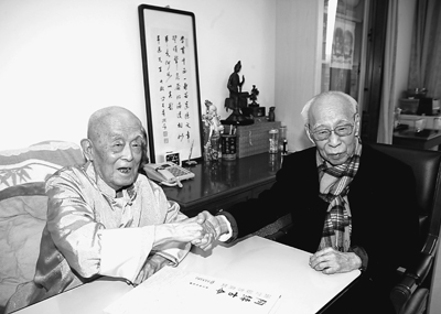 “您是我们国家最高的老师!”10月28日下午,香港著名学者饶宗颐(上图右)专程来到北京解放军总医院看望北京大学教授季羡林时,这样称呼这位学界泰斗(图为王天天摄)。