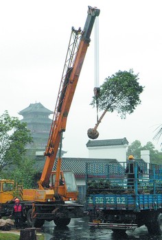 “来了,来了……”在众人的欢呼声中,昨日上午10时许,一辆挂着“刘少奇永远活在人民心中”大红横幅的加长货车,缓慢地驶进了刘少奇纪念馆。“慢点,小心,悠着点……”随后,在纪念馆工作人员的指挥下,等候在花明楼前的大吊车将一株株不断飘散着浓郁香气的桂花树从货车上卸了下来,随后将分别栽种在花明园内。