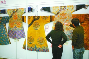 在昨日举行的“2008宫廷艺术品高峰论坛”上,一并展出的7件龙袍、一件清代乾清宫挂毯、一床清代光绪御用黄绸绣陀罗尼经被陈列在最前面。