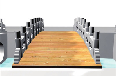 桥上架设栈道 栈道将满铺木板,能够承受游人活动等所产生的荷载强度等。栈道与桥面支撑处将采取弹性相接,并选择桥面范围以外的地方进行固定。