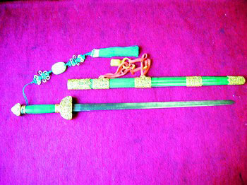 宝剑经收藏者请名家配上剑鞘后,更显尊贵。许馨艺摄
