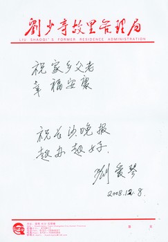 今年11月24日是刘少奇诞辰110周年,此次来参加纪念活动以及昨日追忆活动的刘爱琴是近五年来第一次回家乡。“家乡变化很大,发展也很好,如果父亲看到这些变化,相信也会感到很欣慰的。”刘爱琴说。对家乡父老,刘爱琴深深牵挂。昨日在刘少奇纪念馆,刘爱琴专门托本报向家乡父老问好,书写了“祝家乡父老幸福安康”,同时寄语本报:“祝长沙晚报越办越好”。