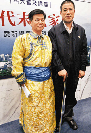 科大老师穿上爱新觉罗恒绍(右)带来的皇家满族服饰,一沾“皇气”。(图片来源:文汇报)