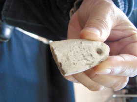 文物中有一个非常漂亮的鱼形石刀残片——一个长五厘米左右的石制“鱼头”,鱼头上刻着鱼眼和鱼鳞,很精美。赵殿坤说,这是当时用的切割工具。由于它比较小,所以做得精致,很有文物价值。
