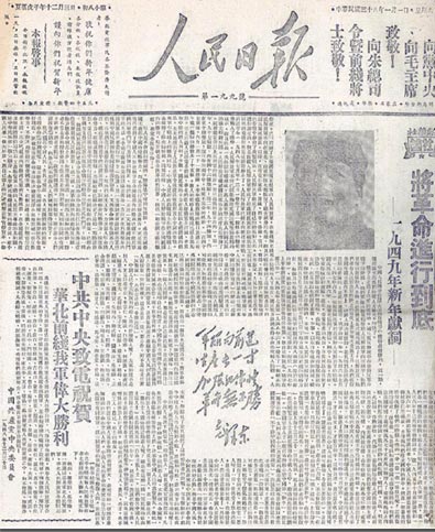 3.1949年1月1日《人民日报》第1版刊登的新华社社论《将革命进行到底 ——一九四九年新年献词》