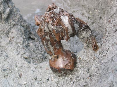 孙国平介绍说,这批古树根是2004年田螺山遗址第一次发掘时出土的,出土前它们一直埋藏在地下水位很高、近乎密封的土壤里。当时地表挖掘的长3米、宽2米的坑中出土了十多株木根,分两大片直立,呈新鲜的黄褐色。木根出土时排成一列非常整齐,在5米外的另一处挖掘地也发现了同样的木根,发现古树根的地块约10多平方米,周围就是村子里的房屋。