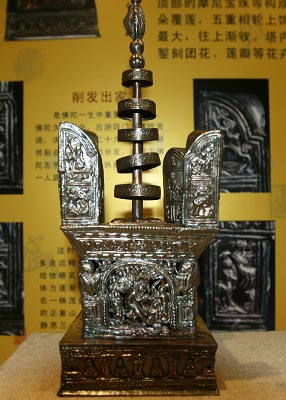 杭州西湖边的雷峰塔,除了让人联想到白娘子和许仙的浪漫传奇,那座2001年在地宫出土的银制“阿育王塔”也是其重宝。但很多人不知道,“阿育王塔”还有一座“姊妹塔”——即天宫中的阿育王塔,因出土时破损严重,一直藏于文保部门。昨天,成功修复后的雷峰塔天宫银质鎏金阿育王塔首次与世人见面——浙江博物馆专门进行了《天覆地载——雷峰塔天宫阿育王塔特展》,展出五代吴越国王钱俶铸造、历代民间仿造的阿育王塔30余座,其中1级品10余件,为国内首次对阿育王塔的集中展示。