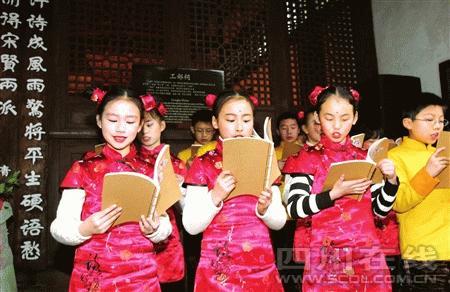 昨日的草堂高朋满座,著名学者、诗人钟树梁、流沙河、张志烈等文人雅士,杜甫草堂诗书画院的艺术家及省内文博单位代表悉数到场,近万成都市民和外地游客也在祭拜活动开始前涌入草堂。10时整,两扇朱门开启,一面印有“草堂人日”字样的幡旗于门前缓缓升起,人们屏住呼吸,现场异常安静。一阵稚嫩童声传来,众人细听,得悉孩童们念诵的正是忧国忧民忧天下的杜甫所作传世诗歌:“安得广厦千万间,大庇天下寒士俱欢颜,风雨不动安如山!”、“国破山河在,城春草木深”、“两个黄鹂鸣翠柳,一行白鹭上青天”……一边应和的是古琴大师们演奏的悠扬古琴,诗圣杜甫心中的那份苍凉诗情,瞬时穿越千年时光,直达众人心中。一杯薄酒,一束腊梅,现场市民游客逐一上前向诗圣像鞠躬行礼,表达对杜甫的敬意。