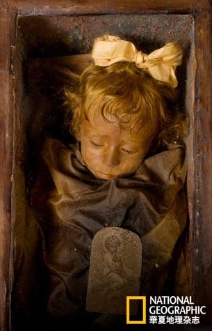 后来的年月里,人们通过压注化学溶液的方法更好地保存尸体,上帝的这项工作被交接到了制尸工匠和科学家手中。一个礼拜堂里的棺材中长眠着小女孩罗萨莉娅·隆巴尔多,她看起来就像正在脏兮兮的棕色床单下沉睡。罗萨莉娅与其他木乃伊不同,她还有头发,用一个大大的黄色蝴蝶扎起来,打着卷儿垂在黄色的前额,像布娃娃一样。她闭着眼睛,睫毛依然丝丝分明,若不是周围堆着咧着嘴的骷髅、弥漫着腐烂的气息,她会被错认为一个在回家的路上打瞌睡的小孩。看着她会想到生与死的差距只在一息之间,这让人心神难定,毛骨悚然。罗萨莉娅两岁的时候染肺炎而死,她的父亲伤心欲绝,悲痛之余请来远近闻名的制尸工匠阿尔弗雷多·萨拉菲亚,让他把女儿的遗体保存下来。制成后的效果栩栩如生,哀恸之情似乎仍萦绕在那颗顶着金发的小脑袋上。在巴勒莫,人们把罗萨莉娅视为一个神奇的小天使。出租司机会问:“你看到罗萨莉娅了吗?可漂亮啦。”
