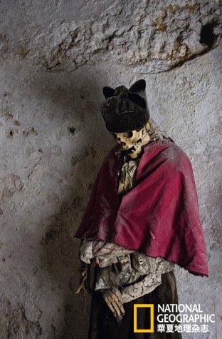 美丽小镇诺瓦拉有一座规模宏大、富丽堂皇的教堂。祭坛前方有一扇通向地下密室的暗门,只需揿动一个隐藏的按钮,电控开关就会把门打开,如同007电影中的情景。下了台阶就能看到一列壁龛,存放着衰败程度各不相同的主教尸体。他们坐着凿了些圆孔的小石椅(供体液渗流),面容僵直,像是在一起享受公厕里的放松时刻。一座摆满了头骨的高架子上有个盒子,里面装着两具自然干化的猫尸,恍若古埃及的魅影。它们困在这地下墓室里,提醒着人们:即使真有九条命,归宿也只有一种。 (来源:《华夏地理》杂志 )