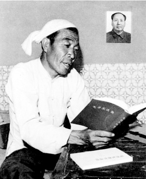 “一走进院子,就看见中间一孔窑洞的窗户上,映出了陈永贵着白毛巾的那颗脑袋。撩开门帘进去,只见他蹲在窗户前的炕上,端着个粗瓷大碗在吃早饭。碗里是这里老乡日常吃的沙粥,那是用小米和玉茭糁熬成的糊糊,窗台上摆着一小碟老咸菜。他穿的还是黑色的中式裤褂,老布鞋。那几个栅栏一样的门牙已经变成了一口白白的义牙,后来我才知道他是牙疼得没办法只好拔了牙齿重新镶的。这一变,面孔显得好看了一点。他一见我们,微微笑了笑,说了句:‘来啦!’这和以前见面打招呼一样。他三口两口把碗底的那点沙粥喝完,把碗搁在窗台上,然后跳下炕来说:‘走,到客厅里去坐。’说是客厅,其实就是窑洞旁的一间大平房。房里摆着几件旧桌凳和橱柜,还有两对简易沙发。他一进客厅就忙着给我们泡茶,拿烟。
