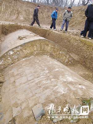 昨天下午,记者来到位于雨花台区铁心桥附近一个叫马家店的村落,这里正在进行京沪高铁的勘探施工。几名工人告诉记者,他们负责在此日夜看护古墓,“因为古墓被发现时,墓门已经被闻风而来的盗墓贼破坏了,东面的一座古墓发现有人进去过的痕迹。”记者爬上西面的一座古墓,只见考古人员已经挖出古墓的地表范围,大部分墓顶已经露出土层。考古人员说,这座古墓比较大,外形保存基本完好,长约有8米,宽约3.5米,近几日就准备打开墓门。”记者看见墓室的圈顶上有一堆看似被动过的乱砖,大约80厘米见方,考古人员介绍说,应当是过去盗墓贼留下的“杰作”。