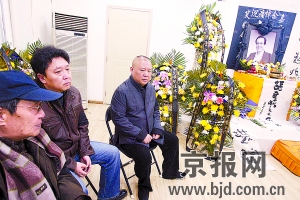 张文顺先生的灵堂设在天桥乐茶园旁边的德云书馆里,面积不大但布置得整洁肃穆,张文顺生前的一张黑白照片摆在灵堂正中,左右两边是郭德纲亲笔书写的挽联,花篮和花圈围绕着整个灵堂,两边的墙上则挂满了张文顺的徒弟张德武、德云社演员何云伟、李菁等人书写的祭幛。