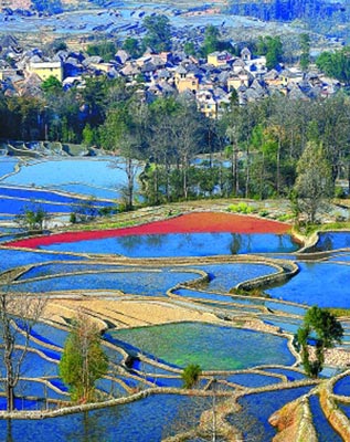 早春二月,云南省红河哈尼族彝族自治州元阳县近20万亩梯田已灌水泡田进入备耕期。放眼望去,山岭沟壑间千层水网,万叠田畴,或波光粼粼,或波平如镜,景色奇幻。每天有众多中外游人及摄影爱好者来这里观光采风。 为将著名的红河哈尼梯田申报为世界文化遗产保护地,云南省红河哈尼族彝族自治州特别邀请由中国社会科学院10多名文史专家组成的国情调查组于2月16日至19日赴元阳县考察梯田,为申遗出谋划策。经数日深入调研,专家们认为,红河哈尼梯田同时具备物质与非物质世界文化双遗产特征,应注重可持续发展,将生态环境保护与水资源科学利用相结合,并多元化立体推介其梯田文化的深刻内涵。