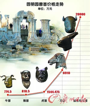 据悉,圆明园十二生肖兽首铜像流散海外近150年来,目前已经有牛、虎、马、猴、猪五首通过各种渠道回归中国,鼠首和兔首铜像也已现身,剩余龙、蛇、羊、鸡、狗五首至今下落不明。