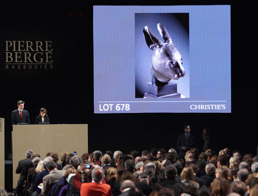 是晚,在巴黎大皇宫举办的“伊夫·圣洛朗与皮埃尔·贝尔热珍藏”专场拍卖会上,编号为六七七和六七八的圆明园鼠首和兔首铜像分别以一千四百万欧元被买家通过同一电话代理人买走。